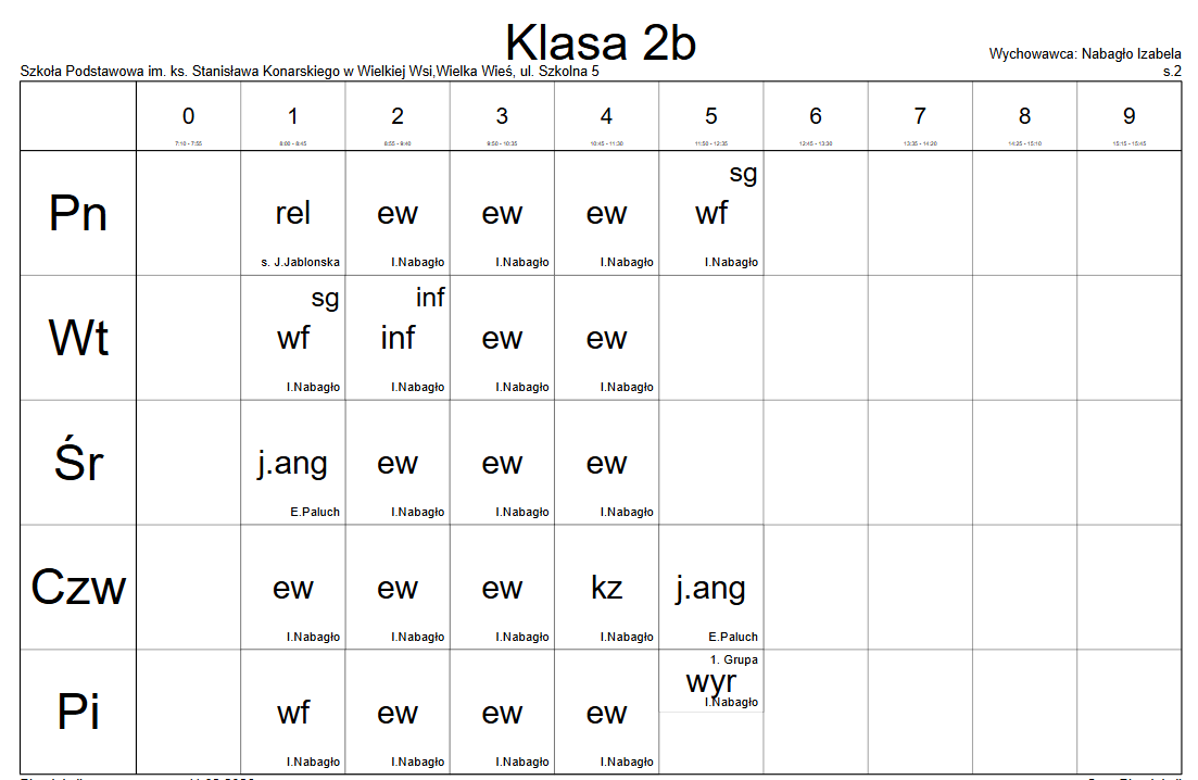 kz - koło zainteresowań (dotyczy całej klasy w klasach 1-3, dotyczy wybranych uczniów w klasach 4-8))
