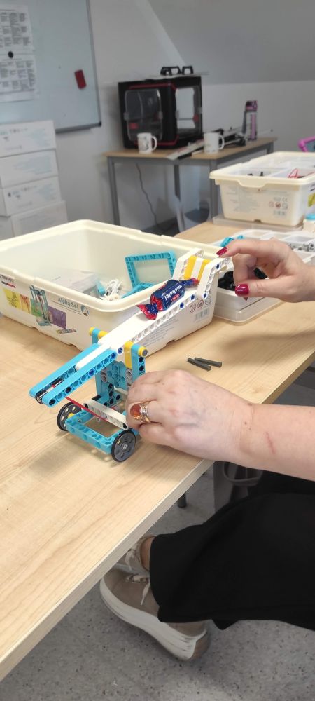 Celem tych szkoleń jest zdobycie przez nauczycieli podstawowej wiedzy i umiejętności niezbędnych do prowadzenia zajęć metodyką STEAM z użyciem narzędzi AI. Na zajęciach nie tylko zdobywaliśmy wiedzę, ale również świetnie bawiliśmy się, wcielając się w uczniów, budując i programując różne modele z klocków. Powstały katapulty, wyrzutnie, wiatraki, a nawet…...śmieciarka. Za pomocą narzędzi AI stworzyliśmy spersonalizowane obrazy, filmy i różne materiały edukacyjne.