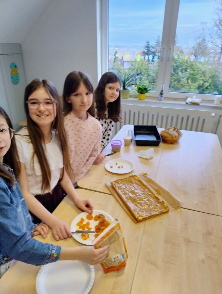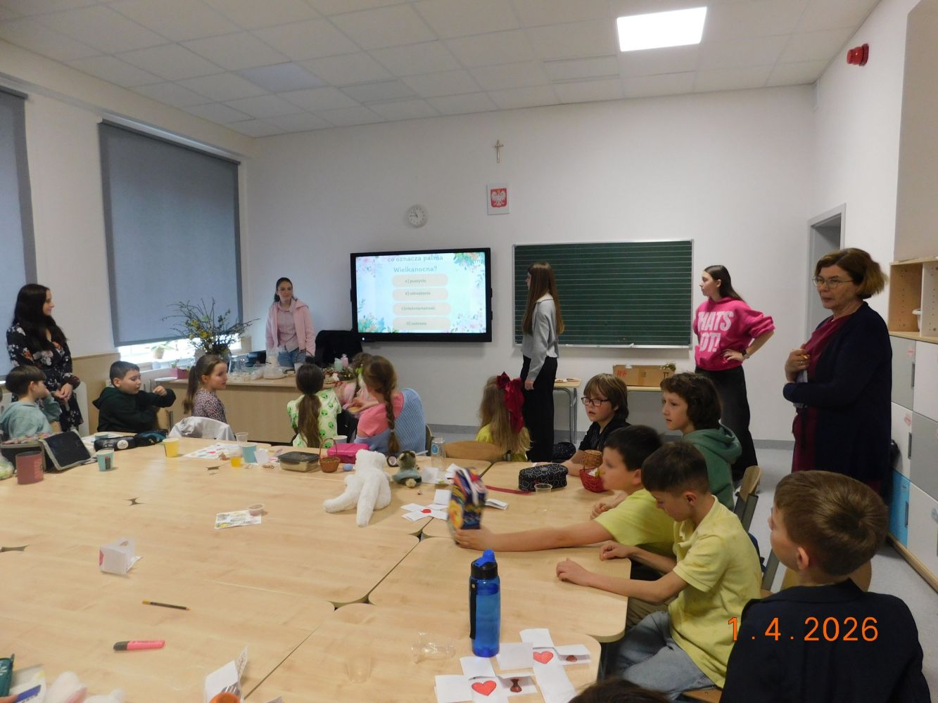 Z kolei nasze starsze koleżanki z klasy 8 odwiedziły młodsze oddziały, by w ciekawy sposób przypomnieć najważniejsze tradycje i zwyczaje wielkanocne. Klasa 4 natomiast pilnie zgłębiała tajniki wiedzy kulinarnej na warsztatach sałatkowych.
