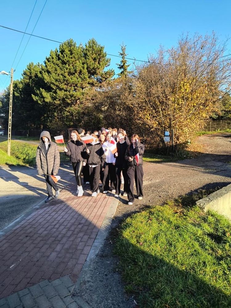 Podczas apelu, który upamiętnia Narodowe Święto Niepodległości uczniowie, nauczyciele i pracownicy szkoły z godną postawą zaśpiewali polski hymn państwowy - „Mazurek Dąbrowskiego”.