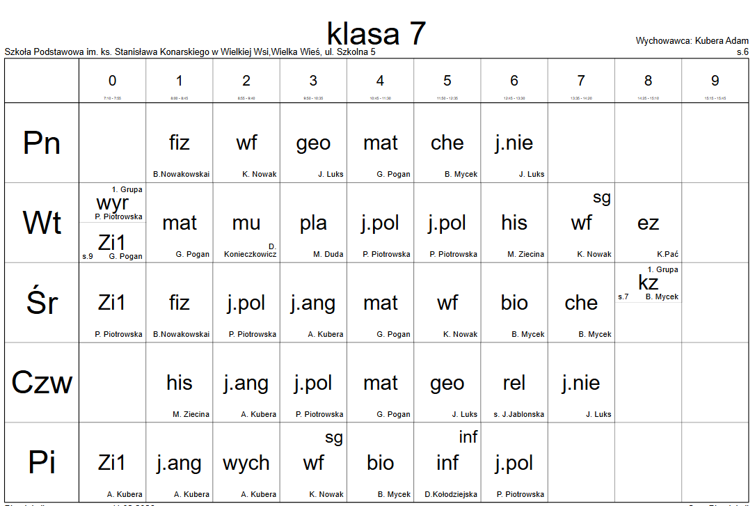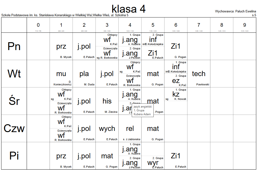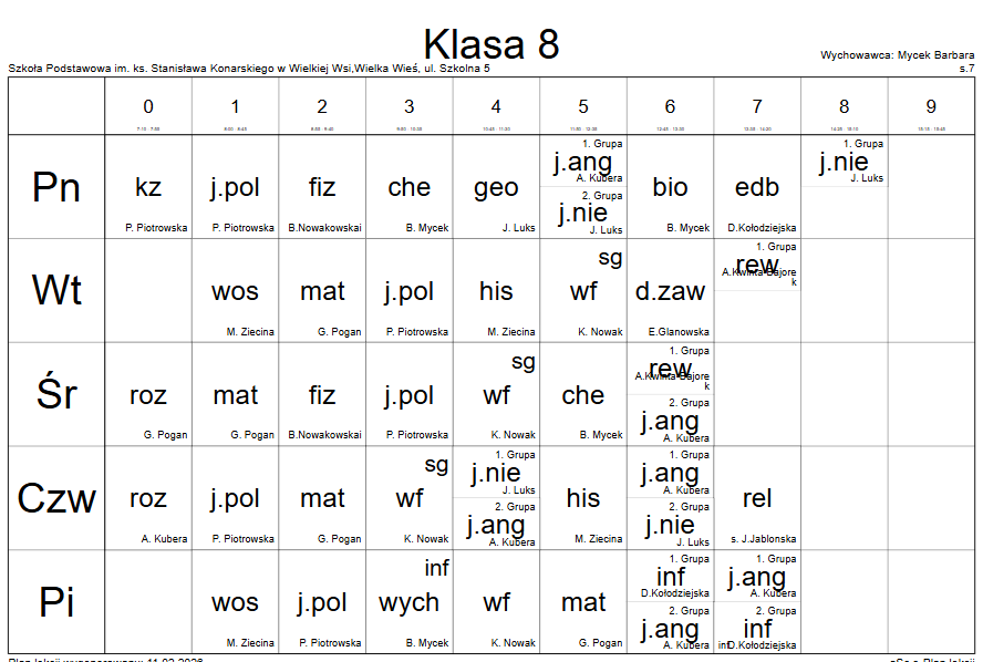 kz - koło zainteresowań (dotyczy całej klasy w klasach 1-3, dotyczy wybranych uczniów w klasach 4-8))