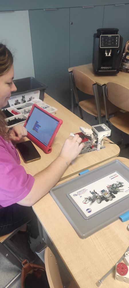 Celem tych szkoleń jest zdobycie przez nauczycieli podstawowej wiedzy i umiejętności niezbędnych do prowadzenia zajęć metodyką STEAM z użyciem narzędzi AI. Na zajęciach nie tylko zdobywaliśmy wiedzę, ale również świetnie bawiliśmy się, wcielając się w uczniów, budując i programując różne modele z klocków. Powstały katapulty, wyrzutnie, wiatraki, a nawet…...śmieciarka. Za pomocą narzędzi AI stworzyliśmy spersonalizowane obrazy, filmy i różne materiały edukacyjne.