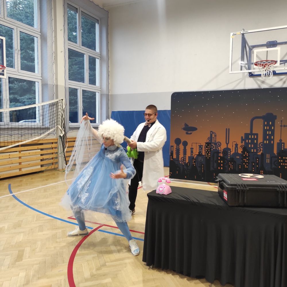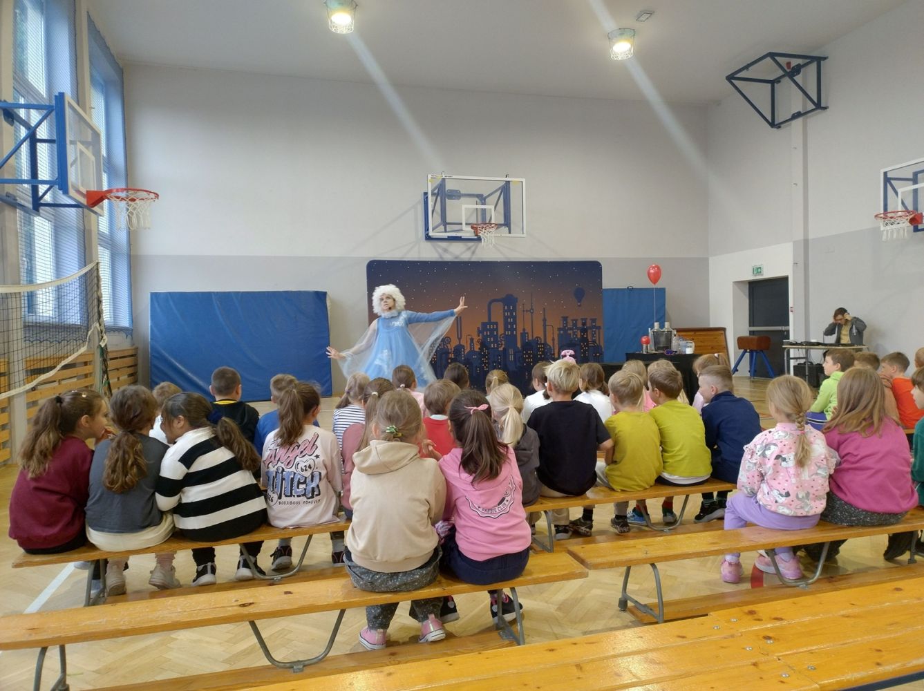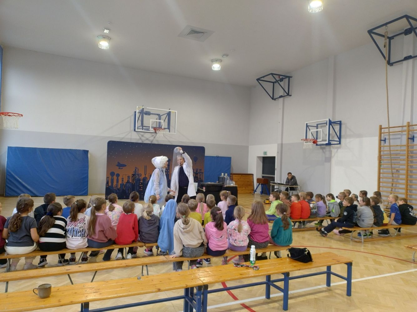 15 października zawitali do nas nietypowi goście.....czyli Profesorek i Chmurka jako mistrzowie energii. W wyjątkowym spektaklu naukowo-edukacyjnym wprowadzili dzieci w świat ekologii, energii i fizycznych eksperymentów. Występujący w spektaklu bohaterowie – Chmurka Cumuluska i Profesorek – poprzez humor, interakcję z dziećmi i spektakularne pokazy naukowe, pomagali uczniom zrozumieć zjawiska fizyczne i chemiczne.