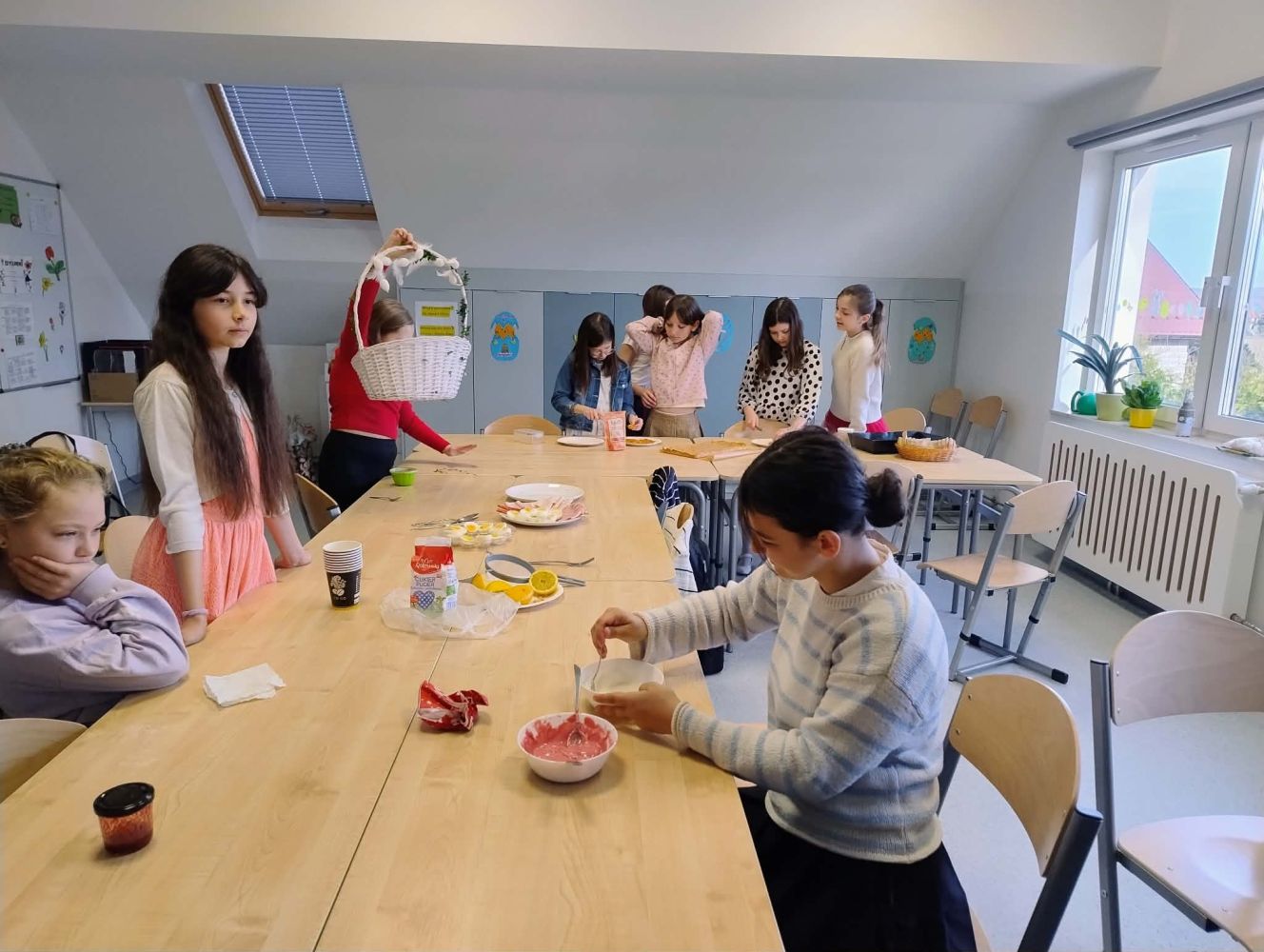 Z kolei nasze starsze koleżanki z klasy 8 odwiedziły młodsze oddziały, by w ciekawy sposób przypomnieć najważniejsze tradycje i zwyczaje wielkanocne. Klasa 4 natomiast pilnie zgłębiała tajniki wiedzy kulinarnej na warsztatach sałatkowych.