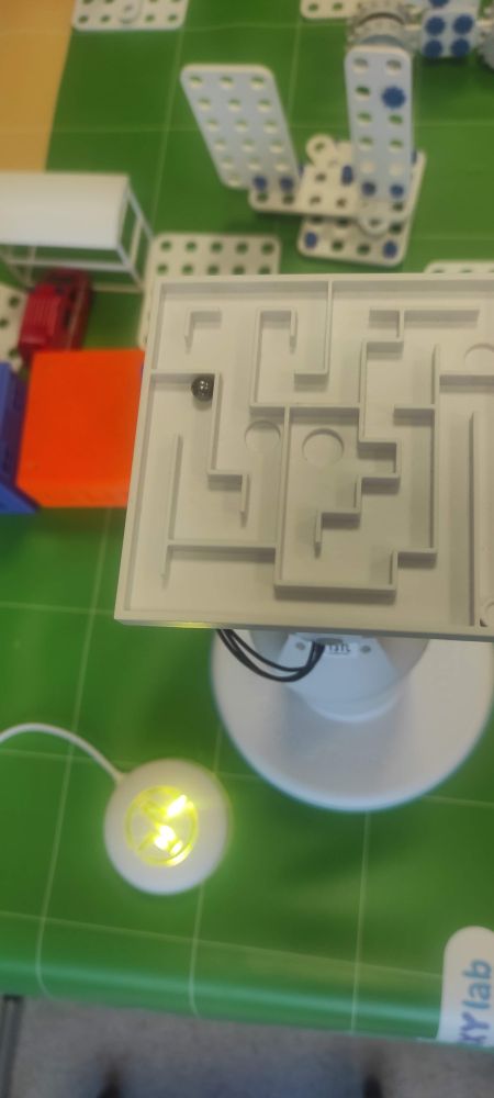 Ostatnim naszym zadaniem było przeprowadzenie kuleczki przez labirynt - za pomocą odpowiedniego programu sterującego nachyleniem kąta platformy labiryntu i zmiana kierunku poruszania się kulki. Tutaj również odnotowaliśmy sukces i kulka dotarła do wyznaczonego celu.
