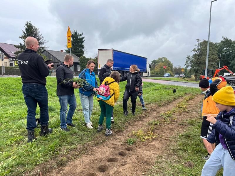 Po solidnej porcji edukacji teoretycznej i praktycznej przyszedł czas na działanie w terenie! Razem z Radnymi miejscowości Wielka Wieś, Sołtysem i Prezesem OSP uczniowie posadzili przed budynkiem wielofunkcyjnym piękne, miododajne krzewy – irgi.